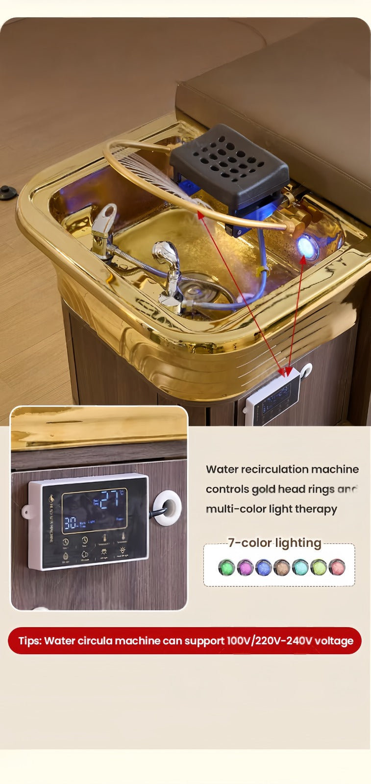 - Bedienfeld zur Einstellung der Wassertemperatur im Spülbecken (Heiz- und Filterwasserpumpe). Dadurch kann während der Behandlung eine konstante Temperatur aufrechterhalten werden.