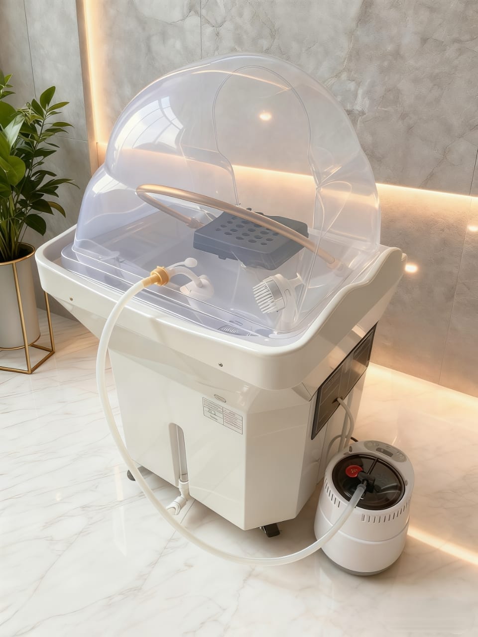 - Tableau de contrôle pour régler la température de l’eau dans le lavavo (Pompe à eau chauffante et filtrante). Cela permet de maintenir une température constante pendant le soin